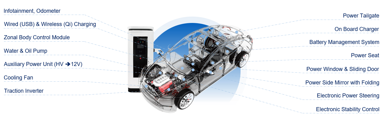 车规级 MOSFET 产品在尽量降低导通内阻的同时,能额外降低器件结电容效应,减少 Qg,进而提供较高的工作效率,减少发热,并且提供兼容市面主流应用先进封装架构,如 PDFN5x6-8L, PowerJE®7x8 (sTOLL 兼容), PowerJE®10 x12 (TOLL 兼容) 常用在电机开关等应用。同时,这些产品经过严格 AEC-Q101 Rev-E 测试,具备高可靠性。