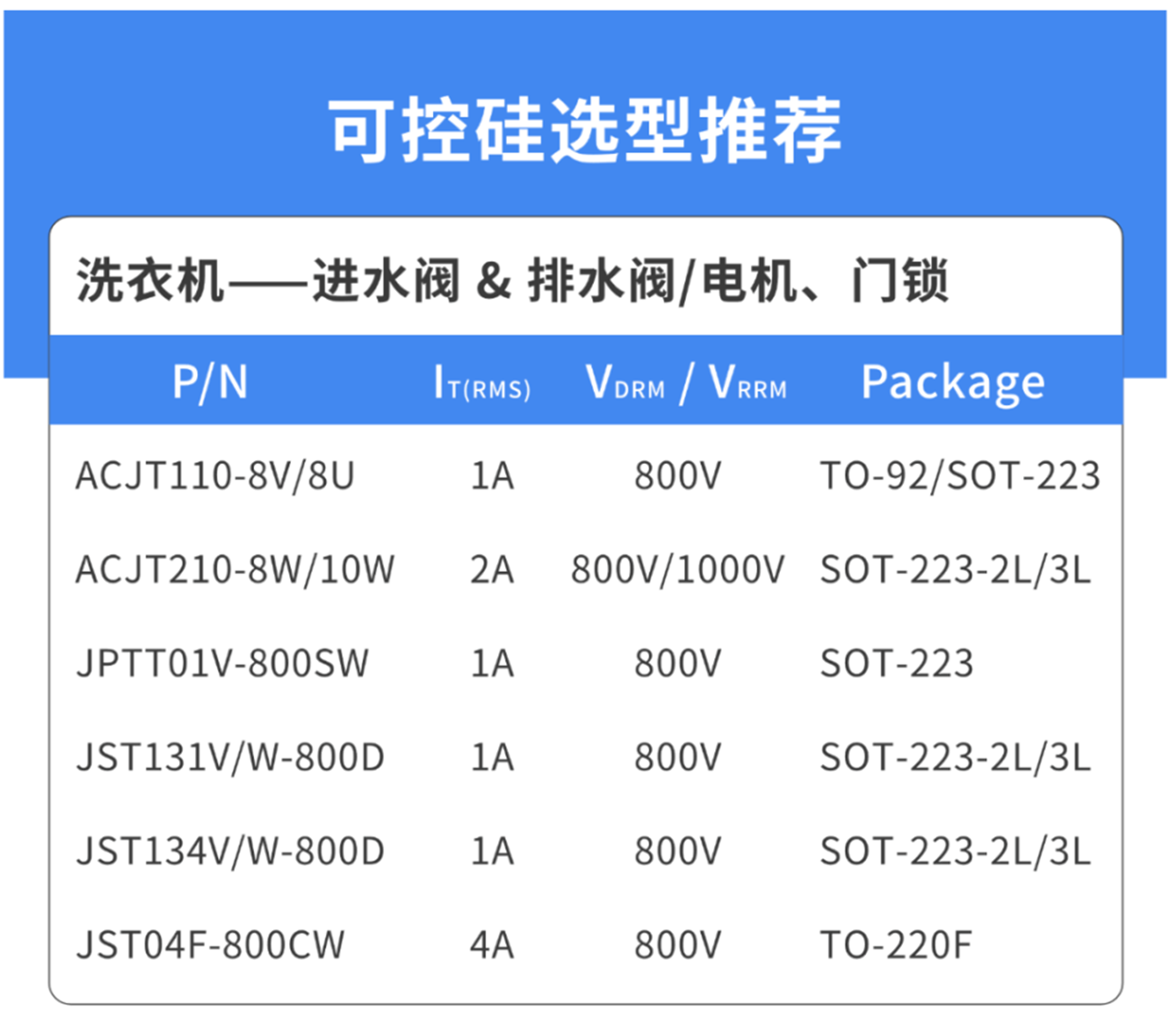 在洗衣机的电路系统中,可控硅是关键元件。AG贵宾会微电针对洗衣机不同控制负载的需求,提供了丰富的可控硅产品选择。在进水阀和排水阀(电机或泵)领域,JPTT01V – 800SW、JST131、JST134、ACJT210、JST04 等型号可控硅,以 1A、2A或4A 的电流和 800V 的耐压值,配合 TO – 92、SOT – 223、TO-220F 等封装形式,稳定控制水流进出。在电机正反转控制方面,T835H-8F、JST12X – 800CW 等 8A – 12A 大电流可控硅,确保电机强劲运转,适应各种电机功率。在滚筒洗衣机的门锁开关和加热环节,同样有适配的可控硅产品,保障洗衣过程的安全与高效。类比同行可控硅,AG贵宾会微电的可控硅抗雷击性能表现卓越,优于部分竞品,有效提升了洗衣机的稳定性和耐用性。